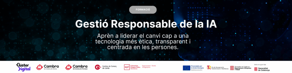 La formació “Gestió Responsable de la IA” és un programa impulsat pel Clúster Digital de Catalunya amb la col·laboració de la Universitat Pompeu Fabra i les Cambres de Comerç de Terrassa, Lleida i Girona. Finançat pel programa RETECH – Línia 4 dins del Pla de Recuperació, Transformació i Resiliència (PRTR) i els fons Next Generation EU